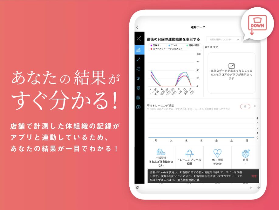 ファディーの会員専用アプリで、体重や体脂肪率の記録ができます。自分の体の変化を目で見て確認できるので、モチベーションアップにつながります。