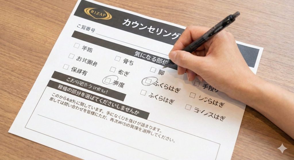 カウンセリングシートには「気になる部位」の「脚やふくらはぎ」の欄に◯をつけておくとカウンセラーさんが話を進めてくれます。